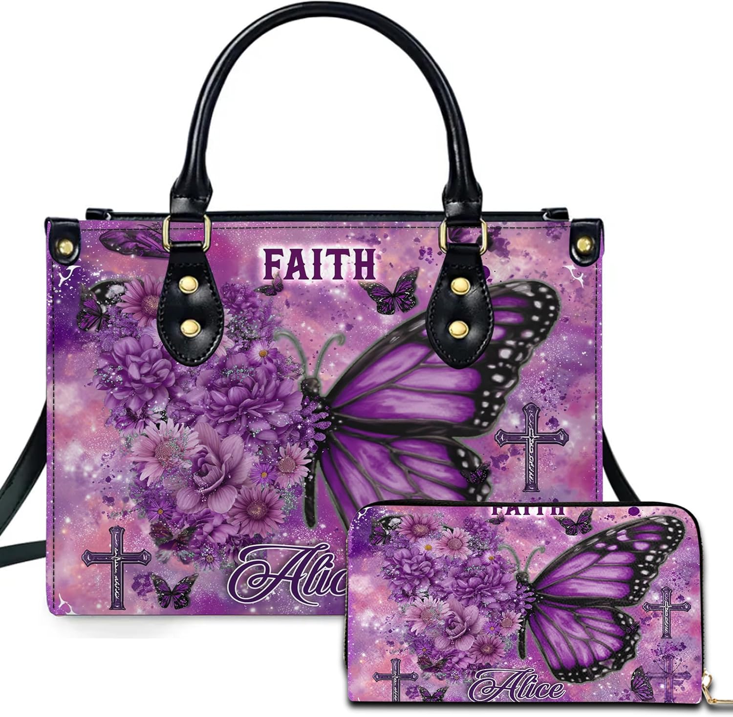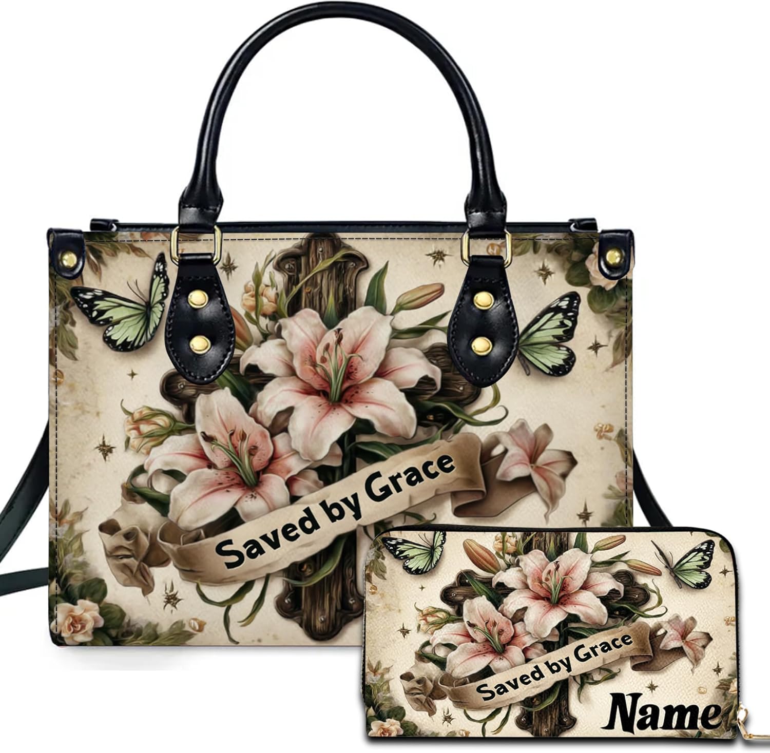Carry your faith in style with the Christian Cross Custom Leather Handbag. This elegant bag features a prominent Christian cross and allows for custom personalization with a name, making it a unique and meaningful accessory. Crafted from premium PU leather, the handbag is soft, durable, and lightweight, ideal for everyday wear. Its spacious interior provides room for essentials, while the secure zipper ensures belongings are safe. The versatile design allows you to carry it as a classic handbag, shoulder bag, or crossbody with the adjustable strap. Pair with an optional matching wallet to complete a coordinated gift set. Perfect as a Christian gift for birthdays, Motherโs Day, Christmas, or just to celebrate faith, this handbag combines practicality, style, and spirituality for a lasting keepsake. ๐ PRODUCT DETAILS Material: PU leather (vegan) Print: Christian cross design with optional name personalization Closure: Full zipper Straps: Top handles + adjustable, removable shoulder strap Bag Sizes: Small / Medium / Large Optional: Matching wallet available Use: Daily carry, church, work, travel, gifting Care: Wipe clean with soft cloth