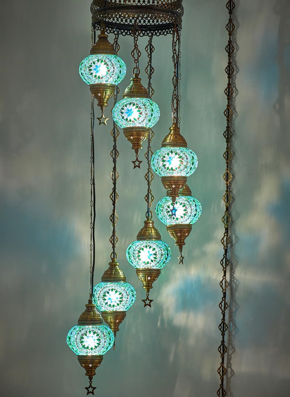 Turkish Moroccan Mosaic Chandelier with 7 Globes/Shades 100% Handmade in Turkey: Crafted with care for worldwide use. Dimensions: Hanging Length (Ceiling to the Last Globe's Bottom): 5 feet Diameter: 14 inches Globe Diameter: 5 inches Convenience Features: Comes with a 15-foot cord and chain, complete with a plug and an on/off switch. No hardwiring required—just plug and enjoy. Bulb Requirements: Uses E12 Type Candelabra/Chandelier LED Bulbs. (Bulbs not included.) Perfect for adding a touch of elegance and warmth to any space!